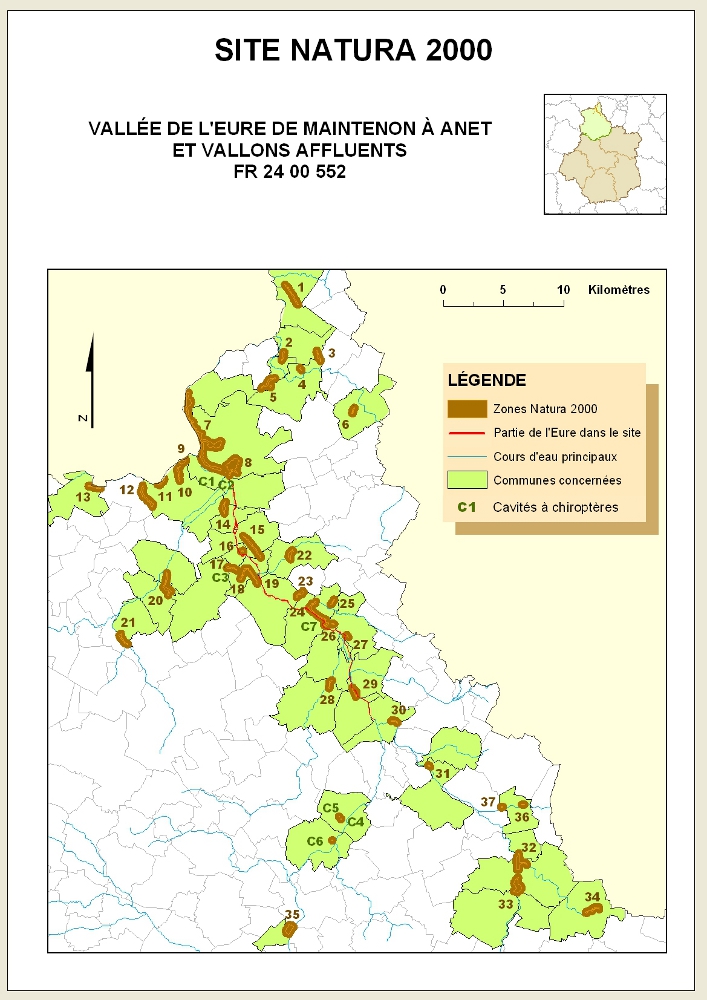 Le site est en fait un ensemble constitué de 37 zones bien délimitées, de taille hétérogène (3 à 150 ha), qui abritent des habitats ou des espèces d'intérêt communautaire. Sa superficie totale est d'environ 750 hectares. Il comprend en plus de ces zones une partie du cours de l'Eure (entre Dreux et Maintenon), ainsi que 7 cavités à chauves-souris. En tout 45 communes sont concernées par le périmètre.